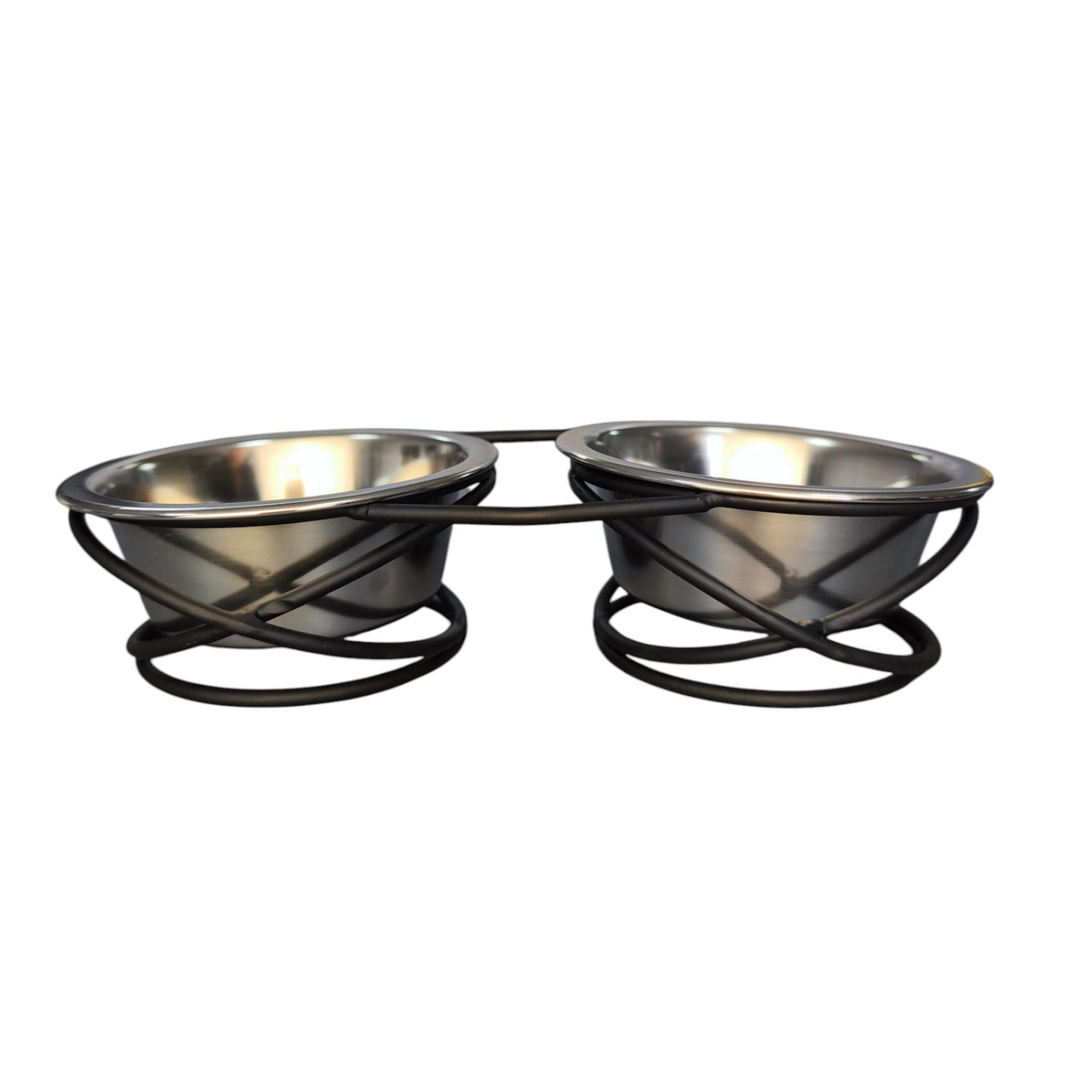 Стильная, плетеная, металлическая подставка с двумя мисками из нержавеющей стали — удобное и практичное решение для кормления питомца.